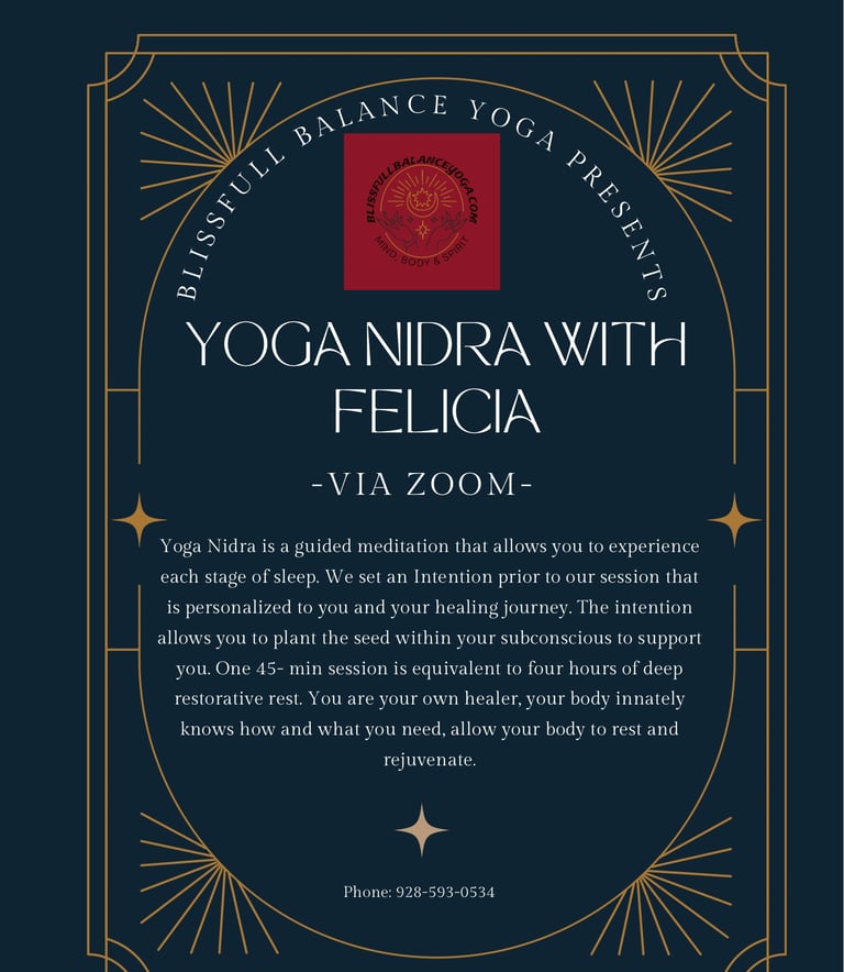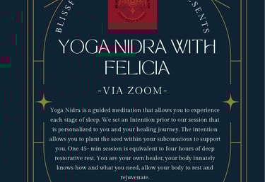 Are you seeking deep relaxation, stress relief, or better sleep? Yoga Nidra, a powerful guided meditation practice, helps you achieve a state of conscious relaxation, providing mental clarity and physical rejuvenation.I’m now offering private Yoga Nidra sessions online via Zoom, available anytime you need a moment of calm and rest. These personalized sessions are designed to meet your unique needs and can be scheduled at your convenience.Book a Session: Choose a time that fits your schedule and book your private Yoga Nidra session via Zoom. Tailored to each session to provide deep Relaxation. In each session, I will guide you through calming techniques aimed at releasing stress and restoring your inner peace. Experience the Benefits: Enjoy a profound sense of relaxation, better sleep, and a clear mind—all from the comfort of your own home. Relieves stress and anxiety. Enhances deep sleep Promotes emotional balance Restores energy and clarity.